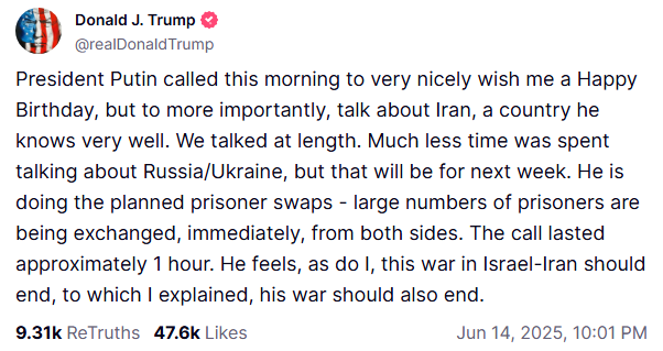 Σύμφωνα με δημοσίευση του Τραμπ στην πλατφόρμα Truth Social, η συνομιλία με τον Πούτιν διήρκεσε περίπου μία ώρα και επικεντρώθηκε σε μεγάλο βαθμό στη σύγκρουση Ισραήλ-Ιράν. Ο Τραμπ σημείωσε χαρακτηριστικά: “Αυτός ο πόλεμος πρέπει να τελειώσει”, υποδηλώνοντας την ανάγκη για άμεση παύση των εχθροπραξιών στη Μέση Ανατολή.